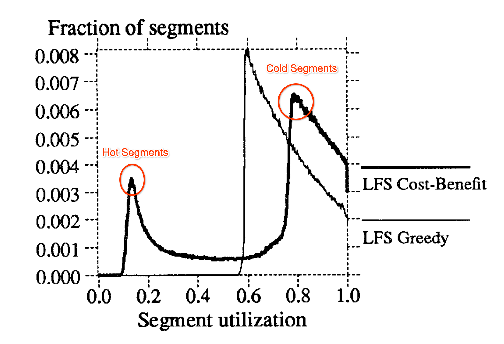 Figure 5 illustrates this: below the cleaning threshold, there are no segments because those segments would have already been cleaned and freed. The curve slopes downward after the cleaning threshold, indicating that most hot segments tend to have lower utilization (just above the cleaning threshold).